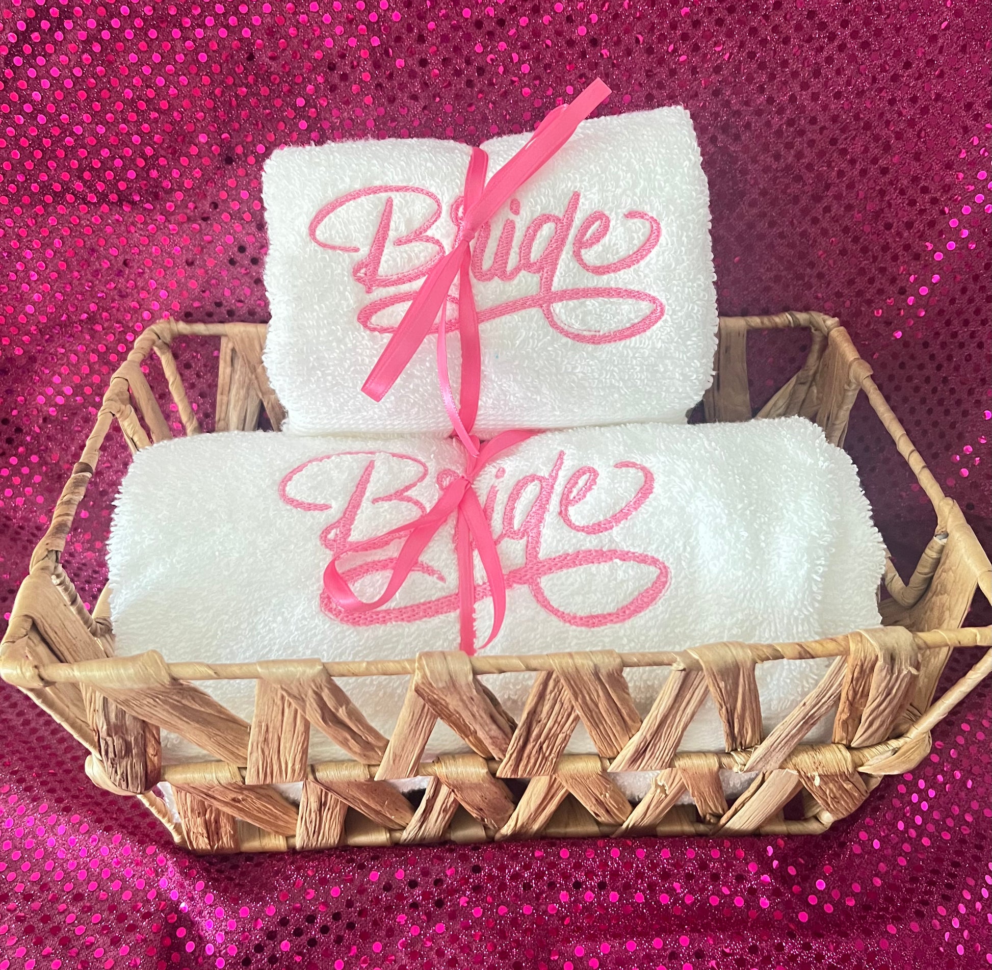 This embroidery hand towel/bath towel is perfect for adding a personalized touch to your bathroom decor, and they make a great gift for the bride. Basket is not included.